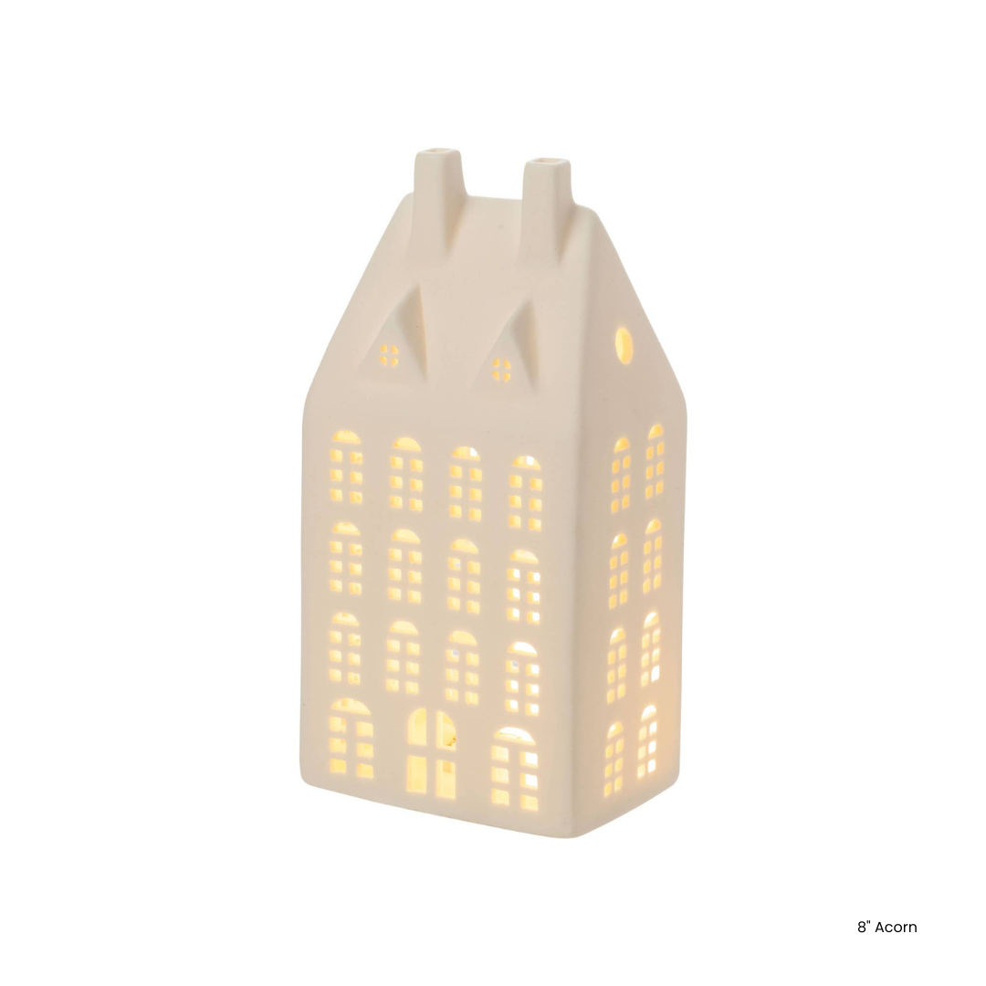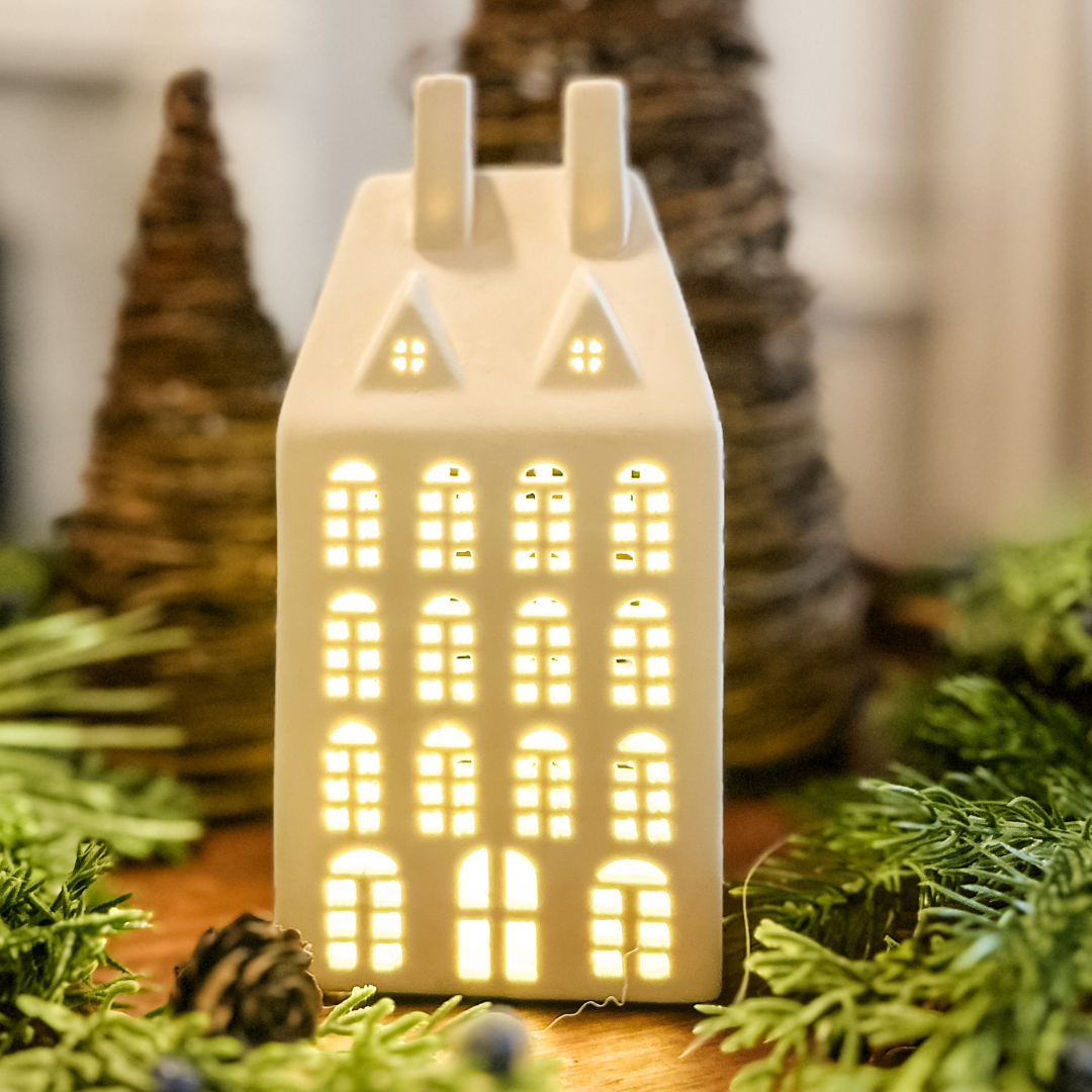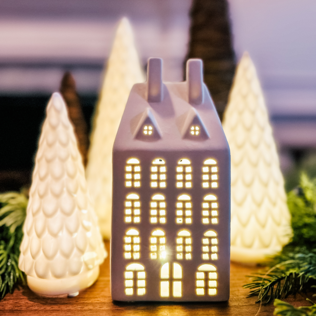 A glowing ceramic accent that adds cozy charm to any mantel or tabletop. Layer on top of your fireplace mantle alongside your winter garland!